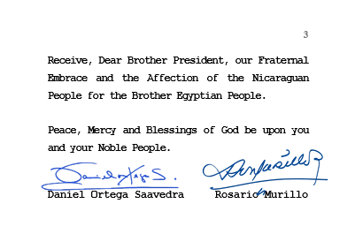 En nombre del Pueblo y Gobierno de Reconciliación y Unidad Nacional de la República de Nicaragua, y en nuestro propio nombre, nos honra hacer llegar a Usted, a su Gobierno y al Heroico Pueblo egipcio, nuestras más cálidas y sinceras felicitaciones al conmemorarse el 104º Aniversario de la Declaración de Independencia de la República Árabe de Egipto, este 28 de Febrero.