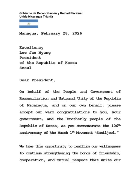 En nombre del Pueblo y Gobierno de Reconciliación y Unidad Nacional de la República de Nicaragua, y en nuestro propio nombre, reciba nuestras Cálidas Felicitaciones a Usted, a su Gobierno y al Hermano Pueblo de la República de Corea, al conmemorarse el 106 Aniversario del Movimiento 1 de Marzo “Samiljeol”.