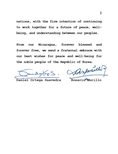 From our Nicaragua, forever blessed and forever free, we send a fraternal embrace with our best wishes for peace and well-being for the noble people of the Republic of Korea.