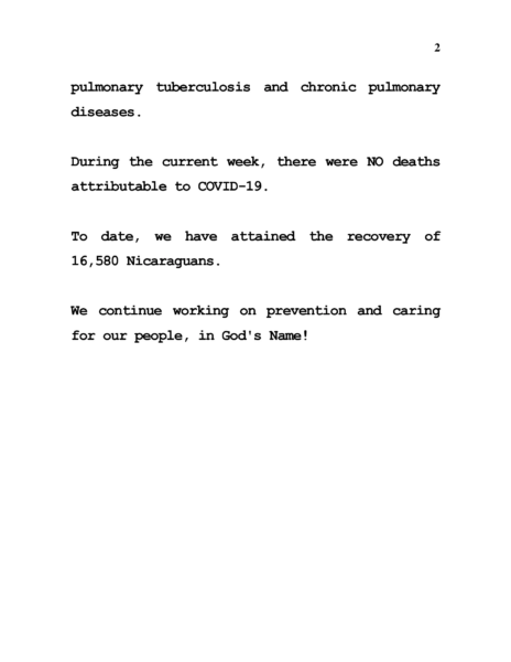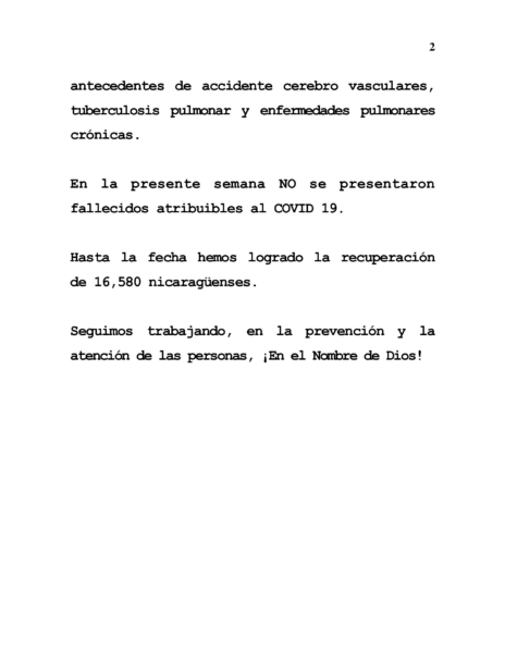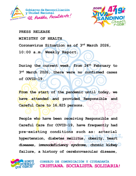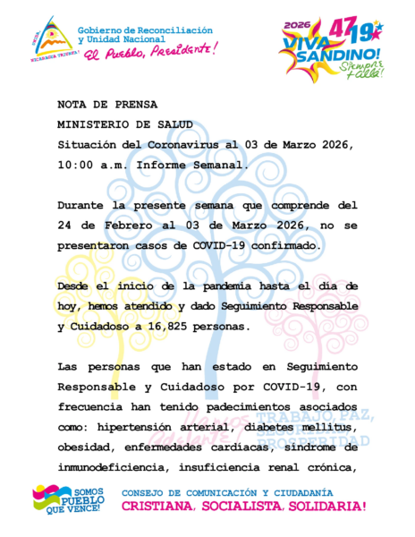 El Ministerio de Salud informa que, del 24 de febrero al 03 de marzo de 2026, no se registraron casos confirmados ni fallecidos por COVID-19, desde el inicio de la pandemia, se ha dado Seguimiento Responsable y Cuidadoso a 16,825 personas, alcanzando 16,580 recuperados.
