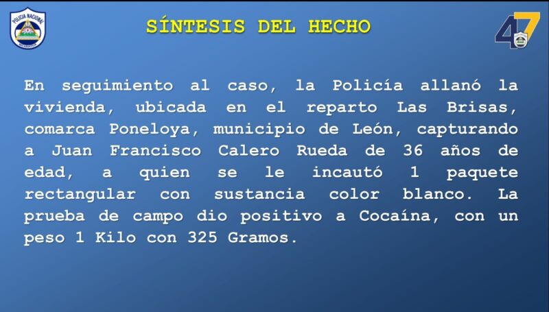 En seguimiento al caso, la Policía Nacional realizó allanamiento en una vivienda ubicada en el reparto Las Brisas, comarca Ponia, municipio de León, donde fue capturado Juan Francisco Calero Rueda, de 36 años de edad. En el lugar se le incautó un paquete rectangular con sustancia color blanco, cuya prueba de campo resultó positiva a cocaína con un peso de un kilogramo con 325 gramos.