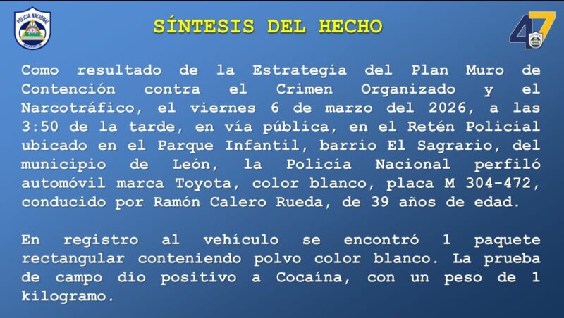 De acuerdo con la síntesis del hecho, el viernes 6 de marzo de 2026 a las 3:50 de la tarde, en un retén policial ubicado en el parque infantil del barrio El Sagrario, municipio de León, oficiales de la Policía Nacional perfilaron un automóvil marca Toyota color blanco, placa M304-472, conducido por Ramón Calero Rueda, de 39 años de edad.
