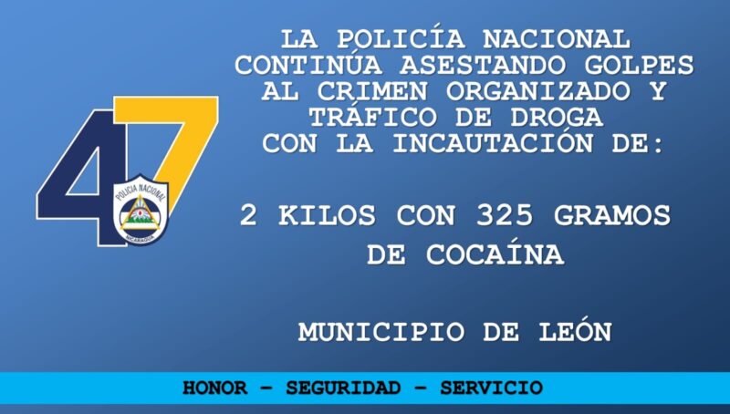 La Policía Nacional asestó un nuevo golpe al crimen organizado y al tráfico de drogas en el departamento de León, con la incautación de dos kilos con 325 gramos de cocaína y la captura de dos personas vinculadas al delito, informó la Subcomisionada Karen Obando, de la Cojefatura de Relaciones Públicas de la institución policial.