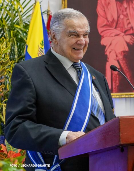 “Entregamos a usted esta merecida distinción como reconocimiento del excelente trabajo realizado en representación del pueblo y gobierno de la República Bolivariana de Venezuela, con el especial cariño de nuestros Copresidentes y del pueblo nicaragüense”, manifestó Jaentschke.