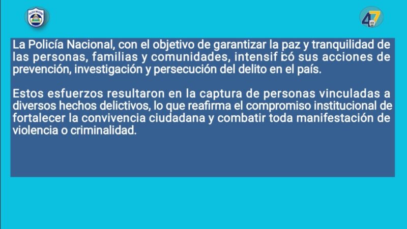 La Policía Nacional reiteró su compromiso de continuar fortaleciendo la seguridad ciudadana, mediante acciones permanentes de prevención y enfrentamiento al delito, con el propósito de proteger la vida y el bienestar de las familias y comunidades nicaragüenses.