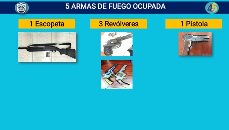 Igualmente, las autoridades policiales incautaron cinco armas de fuego, entre ellas una escopeta, tres revólveres y una pistola.