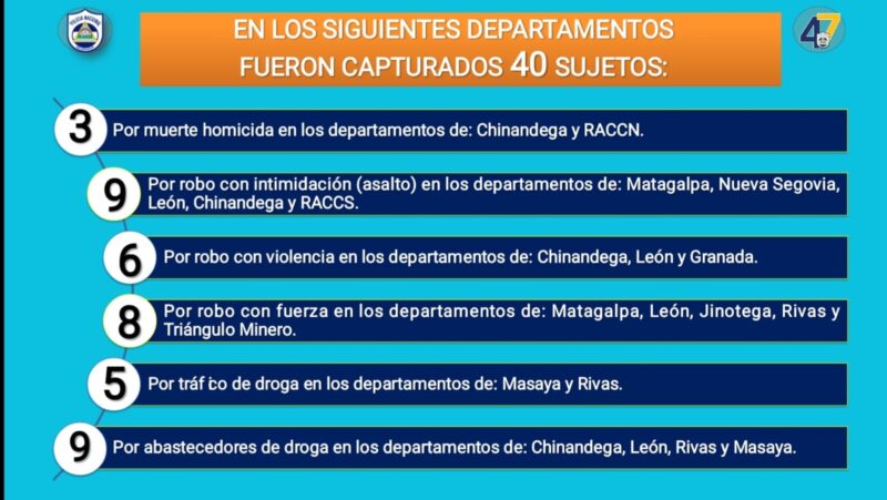 Asimismo, en otros departamentos del país se logró la captura de 40 personas relacionadas con distintos delitos. Entre ellos, tres sujetos por muertes homicidas en los departamentos de Chinandega y la Región Autónoma de la Costa Caribe Norte.