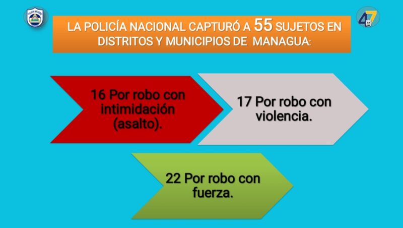 De acuerdo con el informe policial, 55 sujetos fueron capturados en distritos y municipios de Managua, de los cuales 16 están vinculados a robo con intimidación (asalto), 17 por robo con violencia y 22 por robo con fuerza.