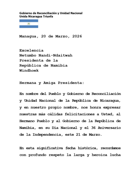 El Copresidente-Comandante Daniel Ortega Saavedra y la Copresidenta Compañera Rosario Murillo enviaron un mensaje de saludo y felicitación a Su Excelencia, Hermana Netumbo Nandi-Ndaitwah, Presidenta de la República de Namibia, con motivo del Día Nacional y el 36° Aniversario de la Independencia de ese hermano país africano. En su mensaje, destacaron los lazos de amistad y solidaridad que unen a Nicaragua y Namibia en la defensa de la soberanía y la justicia social.