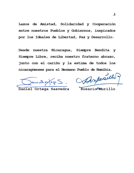 Desde nuestra Nicaragua, Siempre Bendita y Siempre Libre, reciba nuestro fraterno abrazo, junto con el cariño y la estima de todos los nicaragüenses para el Hermano Pueblo de Namibia.