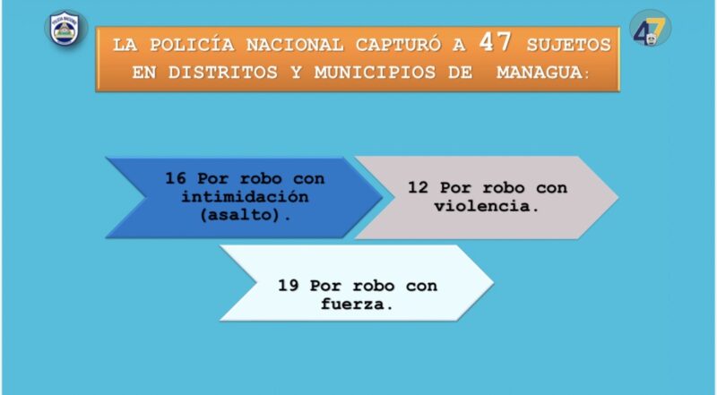 Detalló que, como resultado de estas acciones, se logró la captura de 72 personas vinculadas a distintos delitos. “De este total, 47 fueron detenidas en distritos y municipios de Managua: 16 por robo con intimidación (asalto), 12 por robo con violencia y 19 por robo con fuerza”, agregó Obando.