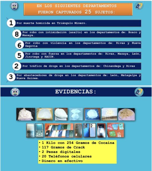 Asimismo mencionó que, en el resto del país, la Policía Nacional reportó la detención de 25 sujetos. Entre ellos, uno por homicidio en el Triángulo Minero; ocho por robo con intimidación en los departamentos de Boaco y Masaya; varios implicados en robos con violencia en Rivas y Nueva Segovia; y cinco por robo con fuerza en Rivas, Masaya, León, Jinotega y la Costa Caribe Norte.