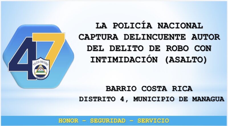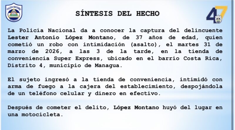 La Policía Nacional informó sobre la captura de Lester Antonio López Montano, de 37 años, señalado como autor de un robo con intimidación ocurrido en el barrio Costa Rica, Distrito 4 de Managua.