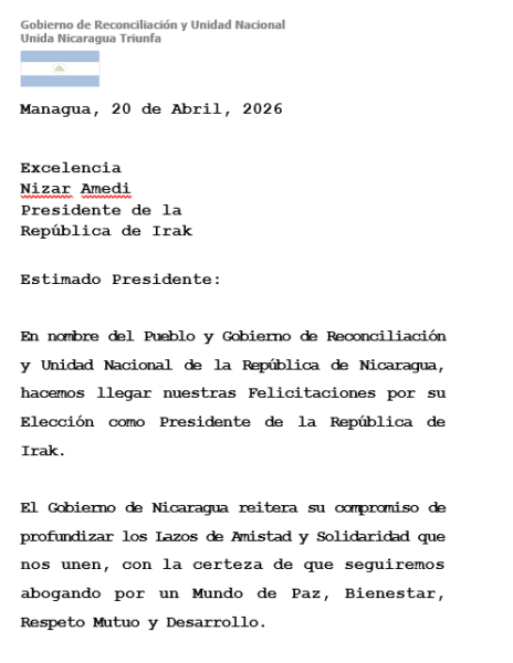 En nombre del Pueblo y Gobierno de Reconciliación y Unidad Nacional de la República de Nicaragua, hacemos llegar nuestras Felicitaciones por su Elección como Presidente de la República de Irak.