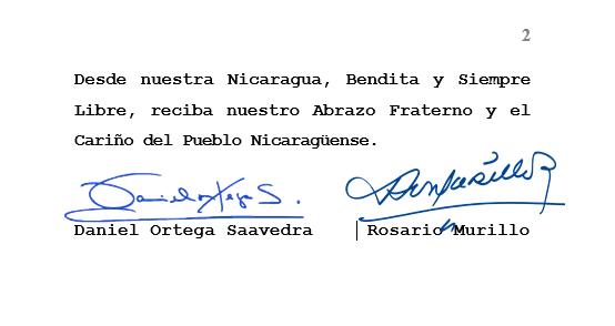 The Government of Nicaragua reiterates its commitment to strengthening the Bonds of Friendship and Solidarity that unite us, with the certainty that we will continue to advocate for a World of Peace, Well-being, Mutual Respect and Development.