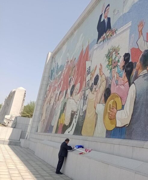 Posteriormente, nuestro Embajador, presentó sus respetos ante el Monumento del Mosaico Conmemorativo, que recuerda cuando el camarada Kim Il Sung, en este mismo sitio, se dirigió por primera vez al Pueblo Coreano, luego de la Liberación de la Patria por parte del Ejército Popular Revolucionario, en el año 1945.