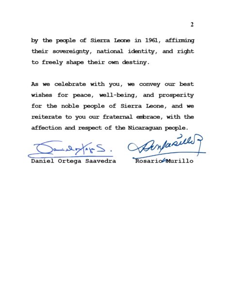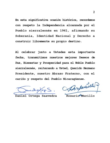 Al celebrar junto a Ustedes esta importante fecha, transmitimos nuestros mejores Deseos de Paz, Bienestar y Prosperidad para el Noble Pueblo sierraleonés, reiterando a Usted, Querido Hermano Presidente, nuestro Abrazo Fraterno, con el cariño y respeto del Pueblo Nicaragüense.