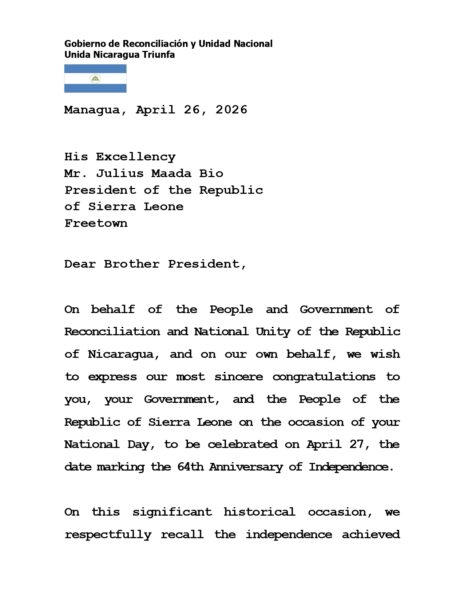 En nombre del Pueblo y Gobierno de Reconciliación y Unidad Nacional de la República de Nicaragua, y en nuestro propio nombre, deseamos expresar nuestras más sinceras felicitaciones a Usted, a Su Gobierno y al Hermano Pueblo de la República de Sierra Leona, con motivo de la celebración de su Día Nacional, el próximo 27 de Abril, fecha en que se conmemora el 64º Aniversario de la Independencia.