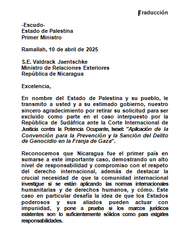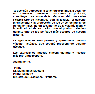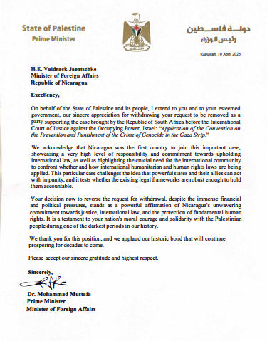 El Primer Ministro y Ministro de Relaciones Exteriores del Estado de Palestina, Dr. Mohammad Mustafa, expresó su profundo agradecimiento al Gobierno de Nicaragua por revocar su solicitud de retirada como parte en el caso presentado por Sudáfrica ante la Corte Internacional de Justicia contra Israel, por la posible violación de la Convención para la Prevención y la Sanción del Delito de Genocidio en Gaza.
