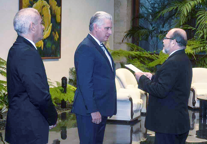 En audiencia solemne en el Palacio de la Revolución el Compañero Miguel Díaz-Canel Bermúdez, Presidente de la República de Cuba, acompañado por el Viceministro Primero de Relaciones Exteriores, Gerardo Peñalver Portal, recibió a primeras horas de la mañana de hoy 7 de Julio, al Compañero Alejandro Solís Martínez, quien entregó Cartas Credenciales que lo acreditan como Embajador Extraordinario y Plenipotenciario de la República de Nicaragua ante la Hermana República de Cuba.