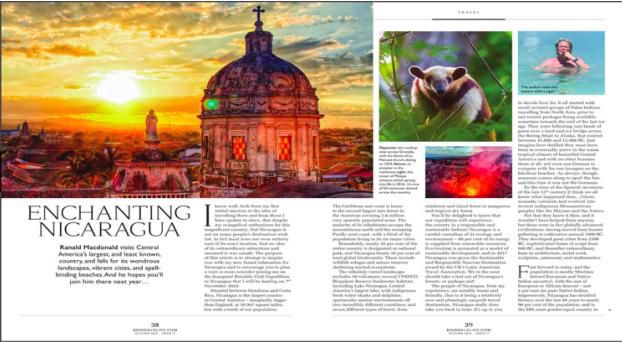 El editor en Jefe de la Revista, el Señor Ranald McDonald, propietario de los Club Boisdale, visitó Nicaragua en 2019, y a su regreso escribió el artículo “Encantadora Nicaragua”, donde expresó su pasión y entusiasmo por nuestra patria, sus ciudades coloniales, playas, volcanes y naturaleza; elogia la paridad de género, la sostenibilidad ecológica y la seguridad que caracterizan a Nicaragua, la hospitalidad y pasión de los nicaragüenses, la calidad sus productos y la fascinante historia de nuestra Patria.