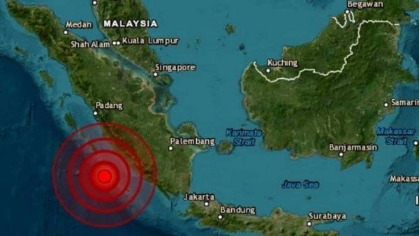 “El epicentro, con una profundidad de diez kilómetros, fue determinado inicialmente a 4,9559 grados de latitud sur y a 100,7384 grados de longitud este”, indicó el USGS.