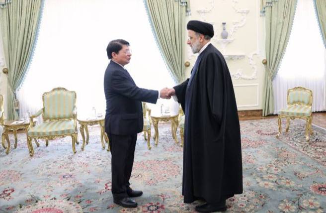 El Presidente Iraní, Ebrahim Raisi y la delegación de Nicaragua conformada por el Compañero Canciller Denis Moncada Colindres, y el Compañero Embajador Isaac Bravo Jaen, sostuvieron un encuentro fraternal en Teherán.