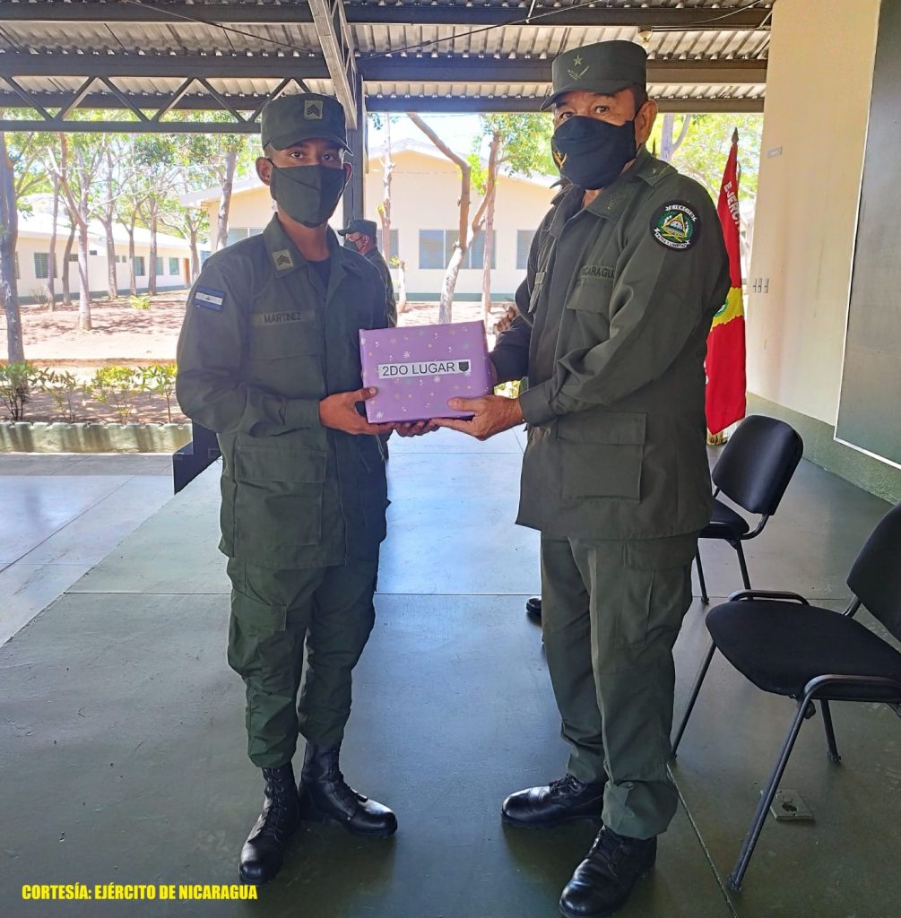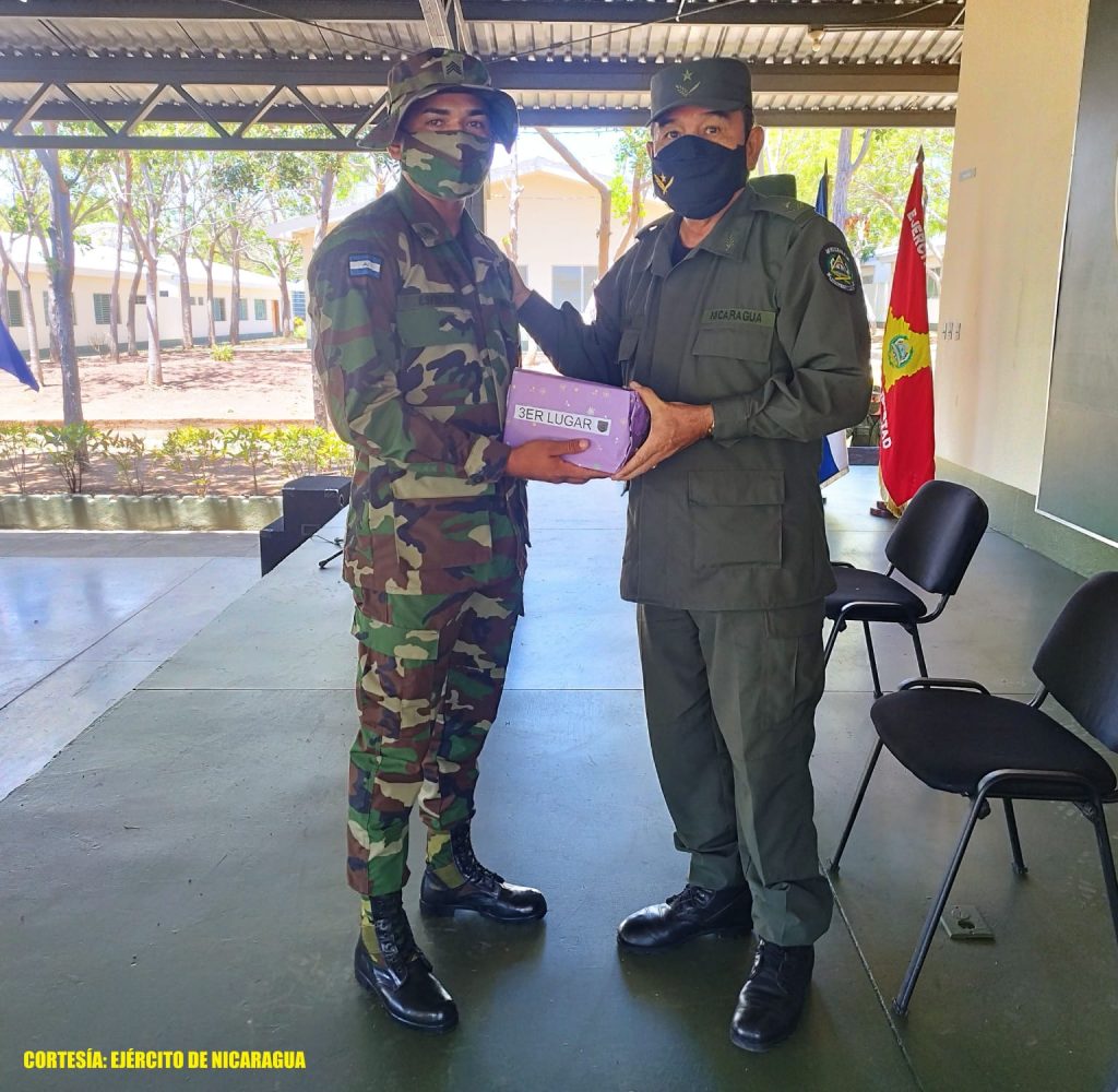 El jefe de la Dirección de Doctrina y Enseñanza, transmitió el saludo del Comandante en Jefe, entregó estímulos a los primeros expedientes y en sus palabras destacó: «…Hoy pasan a incorporarse a las diferentes Unidades del Ejército de Nicaragua, para fortalecer la Disposición Combativa y la ejecución de los planes operacionales y contingentes, lo que conlleva a mantener las mejores condiciones de seguridad, tranquilidad, estabilidad y paz…nos satisface saber que este curso alcanzó una calificación de 87.6 de promedio, equivalente a un rendimiento de Muy Bien en el desarrollo de los planes de estudio…quiero felicitar a todos los que hoy se gradúan especialmente a los que obtuvieron los tres primeros lugares, al Primer Expediente Sargento Tercero Vidal Antonio Hernández Lebrón del Cuerpo de Ingenieros, al Segundo Expediente Soldado de Tercera Clase Berardo Francisco Martínez Velásquez del Cuerpo de Ingenieros y al Tercer Expediente al Soldado de Tercera Clase Roberto José Espinoza Lagos del Cuarto Comando Militar Regional…».