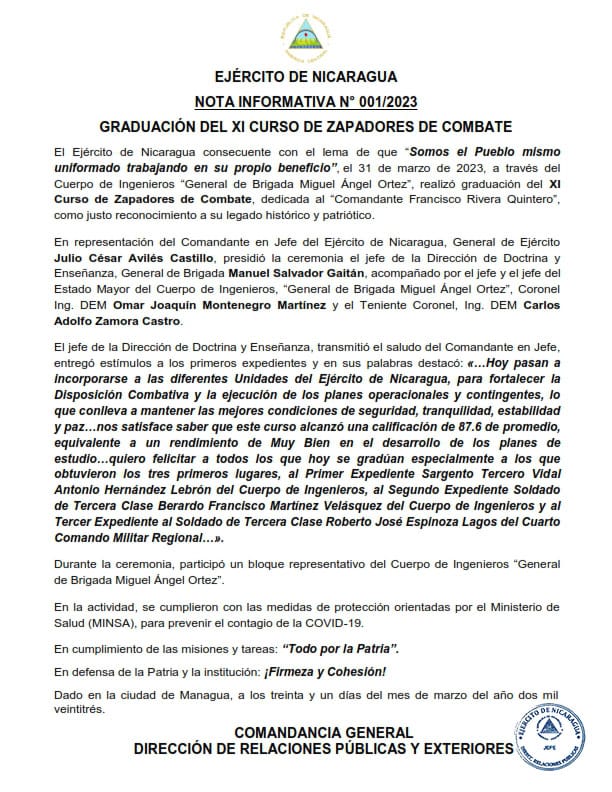 El Ejército de Nicaragua consecuente con el lema de que “Somos el Pueblo mismo uniformado trabajando en su propio beneficio”, el 31 de marzo de 2023, a través del Cuerpo de Ingenieros “General de Brigada Miguel Ángel Ortez”, realizó graduación del XI Curso de Zapadores de Combate, dedicada al “Comandante Francisco Rivera Quintero”, como justo reconocimiento a su legado histórico y patriótico.