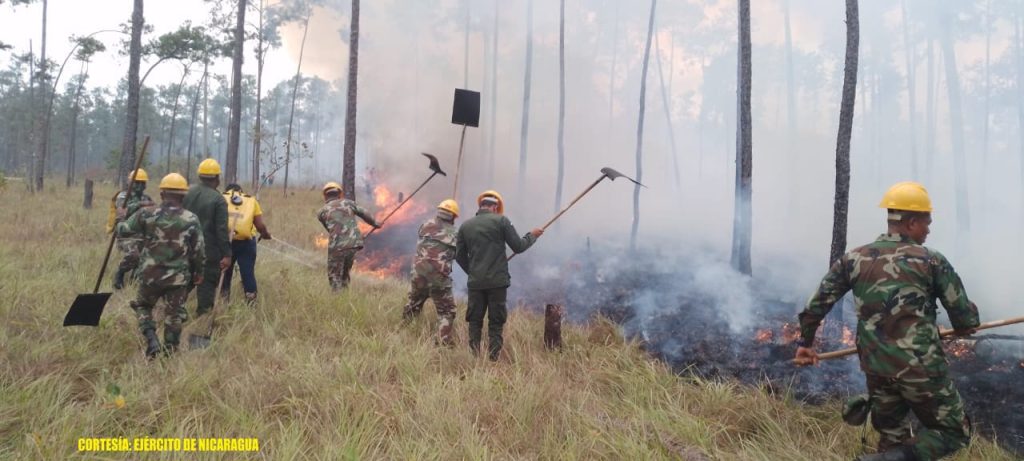 El Ejército de Nicaragua, consecuente con el lema de que “Somos el Pueblo mismo uniformado trabajando en su propio beneficio”, el 12 de abril de 2023, a través del Destacamento Militar Norte, en coordinación con autoridades municipales, participó en la sofocación de incendio forestal, a 5 kilómetros al sur del municipio de Waspam, Región Autónoma de la Costa Caribe Norte, logrando extinguir un fuego en un área de 7 manzanas de bosques.