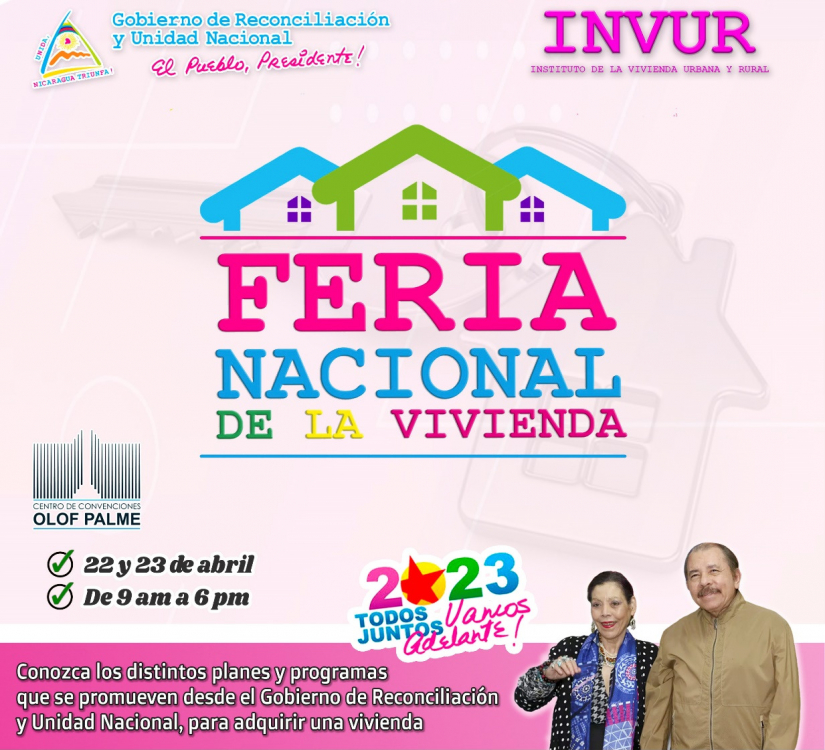 El Gobierno de Reconciliación y Unidad Nacional, a través del INVUR, invita a las Familias nicaragüenses a participar en la “Feria Nacional de la Vivienda”, que se desarrollará los días 22 y 23 de abril, en el Centro de Convenciones Olof Palme.