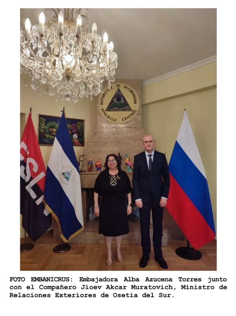 En el marco del fortalecimiento de las Relaciones de Amistad y Solidaridad del Gobierno de Reconciliación y Unidad Nacional de Nicaragua con la República de Osetia del Sur, la Embajadora Alba Azucena Torres recibió una visita de cortesía encabezada por el Señor Jioev Akcar Muratovich, Ministro de Relaciones Exteriores de Osetia del Sur, acompañado por el Embajador Kosaev Narim Sakarovic y la Señora Sara Valieva Eduardovna, Ministra Consejera.