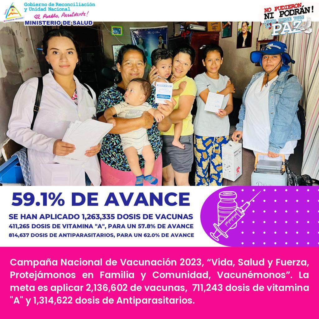 El 11 de Abril inició la Campaña Nacional de Vacunación 2023. Nuestra meta al 30 de Abril es aplicar 2,136,602 dosis de vacunas y se han administrado 1,263,335 dosis, con cumplimiento del 59.1%.