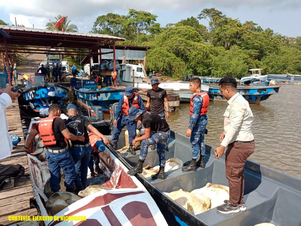 El Ejército de Nicaragua consecuente con el lema de que “Somos el Pueblo mismo uniformado trabajando en su propio beneficio”, del 24 al 26 de abril de 2023, a través de sondeos rutinarios del Distrito Naval Caribe, a 8 millas náuticas al noroeste del municipio de Bluefields, Región Autónoma de la Costa Caribe Sur y a 2 millas náuticas al noreste de la Barra de Crucira, Región Autónoma de la Costa Caribe Norte, ocupó 26 tortugas verdes de la especie “Chelonia Mydas” y 4 sacos conteniendo un interior 339 libras de pepino de mar café de la especie ‘’holothuridae’’, las que eran trasladadas de manera ilegal en 2 embarcaciones tipo panga de nombres “LADY KEVAHUA” y “TRES HERMANOS VI”, violentando las regulaciones establecidas en el país.
