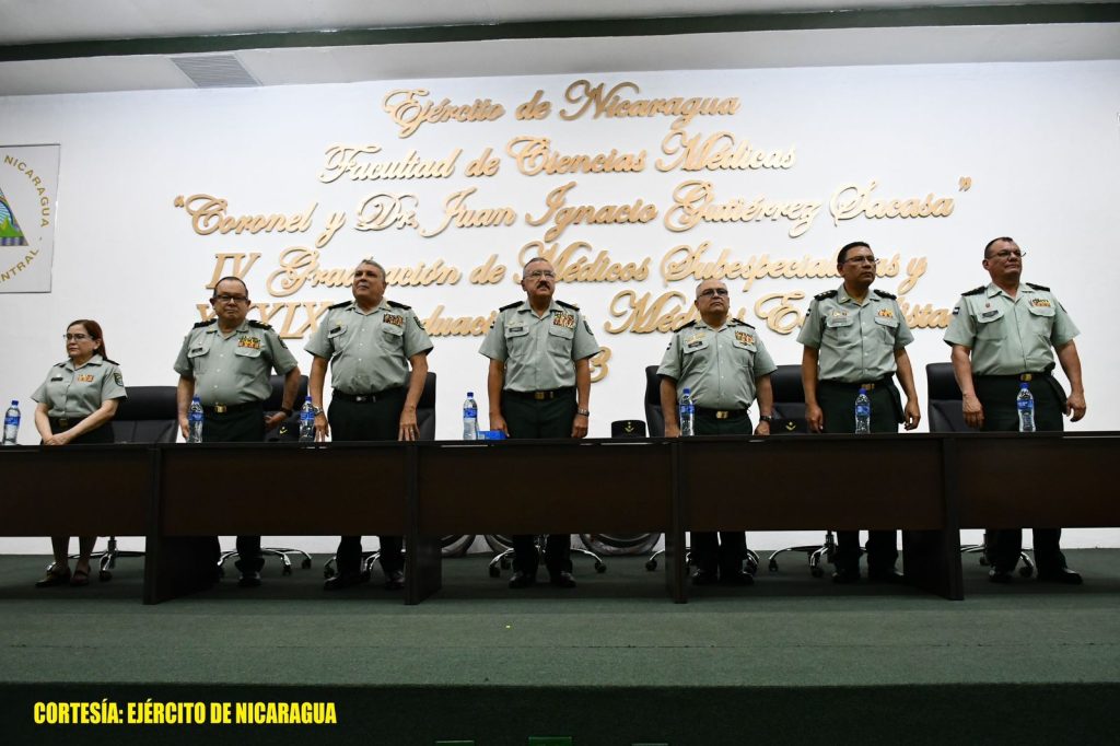 En representación del Comandante en Jefe del Ejército de Nicaragua, General de Ejército Julio César Avilés Castillo, presidió la ceremonia el Inspector General, Mayor General Marvin Elías Corrales Rodríguez, acompañado por el segundo jefe de Estado Mayor General, General de Brigada Spiro José Bassi Aguilar, el rector de la Universidad de Defensa de Nicaragua, General de Brigada Manuel Geovanni Guevara Rocha, el jefe del Cuerpo Médico Militar, Coronel y doctor Marco Antonio Salas Cruz, el segundo jefe del Cuerpo Médico Militar y director del Hospital Militar Escuela “Dr. Alejandro Dávila Bolaños”, Coronel y doctor Noel Vladimir Turcios Arróliga, el subdirector médico del Hospital Militar Escuela “Dr. Alejandro Dávila Bolaños”, Coronel Héctor José Rugama Mujica y la decana de la Facultad de Ciencias Médicas “Coronel y Doctor Juan Ignacio Gutiérrez Sacasa”, Teniente Coronel y doctora Angélica Alvarado Vanegas.