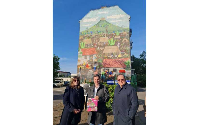 El evento contó con la visita y los saludos del recién electo Alcalde del Distrito de Lichtenberg, Señor Martin Schaefer, quien destacó los Lazos de Amistad entre nuestros Pueblos, como lo demuestra este Mural Nicaragua-Monimbó en Lichtenberg y mostró interés en conocer e intercambiar experiencias, en temas como Cambio Climático.