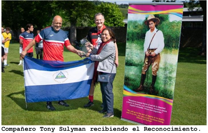 También entregó reconocimiento al compañero Tony Sulyman, amigo de Nicaragua, quien ha participado desde 1980 en los torneos anuales de la Copa Sandino, agradeció expresando su compromiso de continuar promoviendo la Hermandad entre Bristol y Puerto Morazán, motivando la participación de jóvenes en este Torneo Anual con que se celebra al Héroe Nacional de Nicaragua.