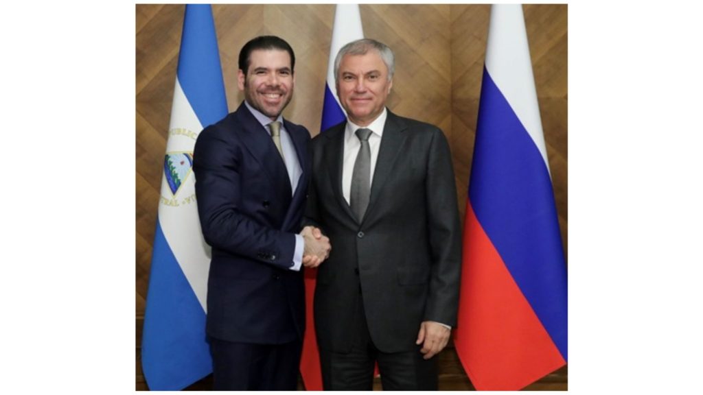 Una Delegación del Gobierno de Nicaragua se ha reunido hoy Lunes 22 de Mayo con el Compañero Vyacheslav Volodin, Presidente de la Duma Estatal de la Federación de Rusia. La Delegación nicaragüense la componen los Compañeros Laureano Ortega Murillo, Asesor Presidencial; Iván Acosta, Ministro de Hacienda y Crédito Público y Alba Torres, Embajadora de Nicaragua.
