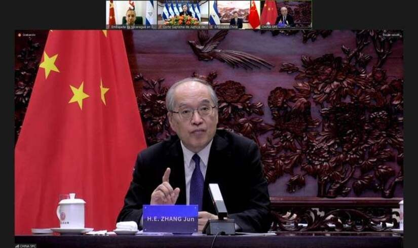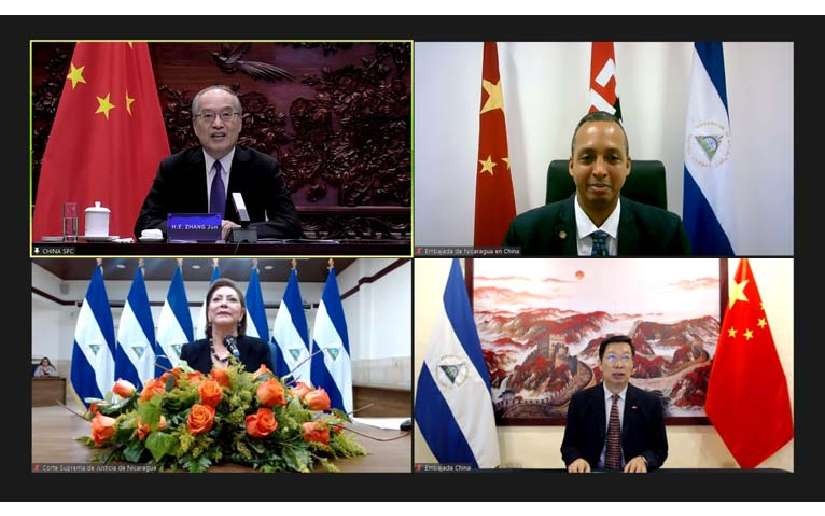 El 27 de junio se llevó a cabo una reunión virtual entre el Magistrado Presidente del Tribunal Supremo de la República Popular China, Compañero Zhang Jun, y la Magistrada Presidenta de la Corte Suprema de Justicia de la República de Nicaragua, Compañera Alba Luz Ramos.