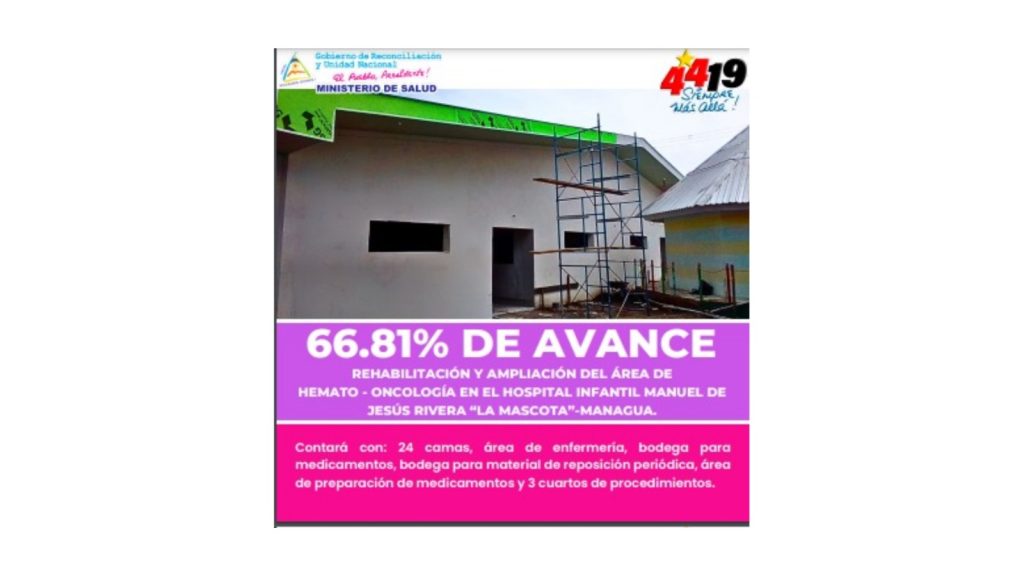 Actualmente, se realizan las obras de rehabilitación y ampliación del área de Hemato-Oncología del Hospital Infantil Manuel de Jesús Rivera “La Mascota”, Managua, para atender en mejores condiciones a más de mil niñ@s que anualmente reciben tratamiento contra el cáncer.