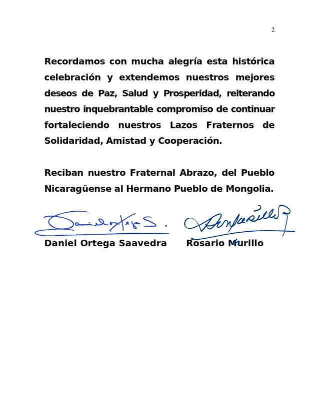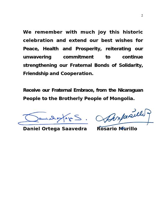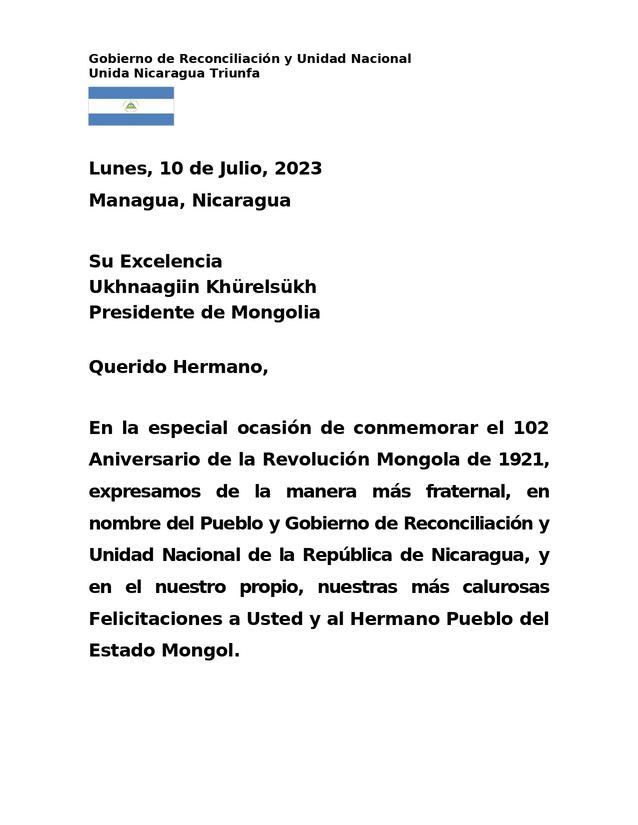 En la especial ocasión de conmemorar el 102 Aniversario de la Revolución Mongola de 1921, expresamos de la manera más fraternal, en nombre del Pueblo y Gobierno de Reconciliación y Unidad Nacional de la República de Nicaragua, y en el nuestro propio, nuestras más calurosas Felicitaciones a Usted y al Hermano Pueblo del Estado Mongol.