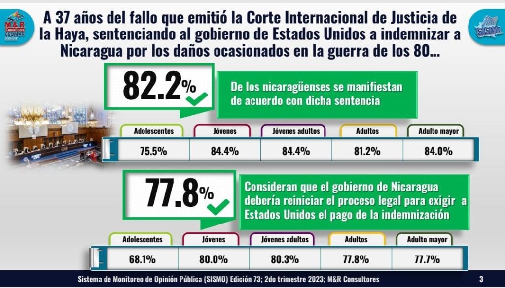 M&R Consultores presentó los resultados de la encuesta del segundo Trimestre del 2023 referida al sistema de monitoreo de la opinión pública que aborda la percepción de los ciudadanos y ciudadanas con respecto al fallo que emitió la Corte Centroamérica de Justicia de la Haya, sentenciando al gobierno de los Estados Unidos a indemnizar a Nicaragua, por los daños ocasionados en la guerra de los años 80.