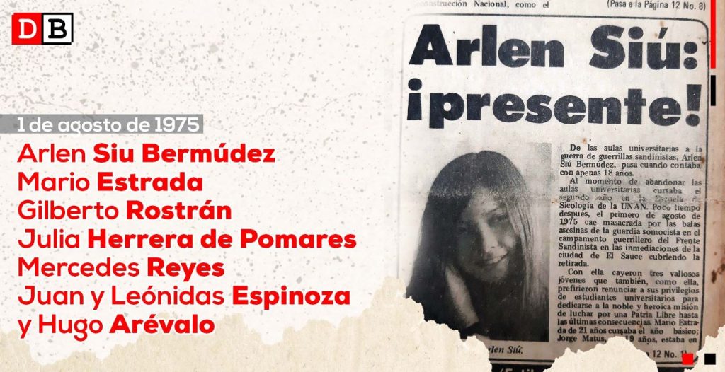 El 1 de agosto de 2975, hace 48 años, Arlen Siu Bermúdez, Mario Estrada, Gilberto Rostrán, Julia Herrera de Pomares, Mercedes Reyes, Juan y Leónidas Espinoza y Hugo Arévalo, cayeron en combate en un enfrentamiento con la Guardia Nacional en El Sauce, León.