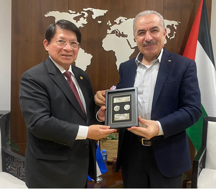 El Primer Ministro, Dr. Mohammad Shatyyeh, agradeció la visita de la Delegación de Nicaragua y compartió información sobre la ocupación ilegal israelí en territorio de Cisjordania, donde alrededor del 40% del territorio está bajo ocupación de colonos o militares sionistas, albergando a más 285 colonias y aproximadamente 755,000 colonos ilegales judíos.