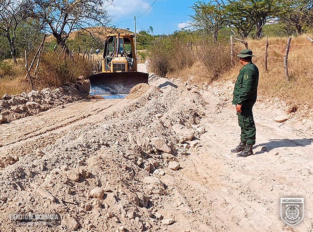 El Ejército de Nicaragua consecuente con el lema de que “ Somos el Pueblo mismo uniformado trabajando en su propio beneficio” , del 11 al 21 de enero de 2024, a través del Cuerpo de Ingenieros “General de Brigada Miguel Ángel Ortez y Guillén”, en coordinación con autoridades municipales, realizó la reparación de 2,500 metros lineales de camino en la comunidad de Mimba, municipio de Larreynaga, departamento de León.
