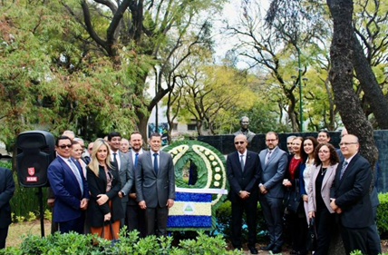 El Señor Imanol Belausteguigoitia Reyes, Representante de la Cancillería Mexicana, el Señor Mohamed Saadat, Embajador de Palestina y Decano del Cuerpo Diplomático y el Compañero Juan Carlos Gutiérrez Madrigal, Embajador de Nicaragua en México, colocaron una ofrenda floral en el busto del Príncipe de las Letras Castellanas y Padre del Modernismo.