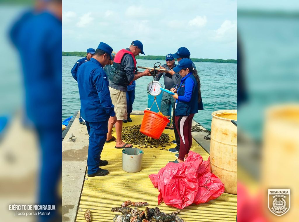 El Ejército de Nicaragua consecuente con el lema de que “Somos el Pueblo mismo uniformado trabajando en su propio beneficio”, el 16 de febrero de 2024, a través de patrulla naval y línea de vigilancia del Distrito Naval Caribe, en las coordenadas φ=14º24’37’’N λ=082º49’01’’W, a 4 millas náuticas al noreste de Cayos Miskitos Región Autónoma de la Costa Caribe Norte, ocupó pepinos de mar de las especies “Petate, Molongo y Lápiz”, que eran trasladados de manera ilegal a bordo de 2 embarcaciones tipo panga de nombres “Star Jhoes” y “Roy Yesca” y 3 veleros “Cap. Jagier”, “Wites Buay” y “Wites Buay”, violentando las regulaciones establecidas en el país.