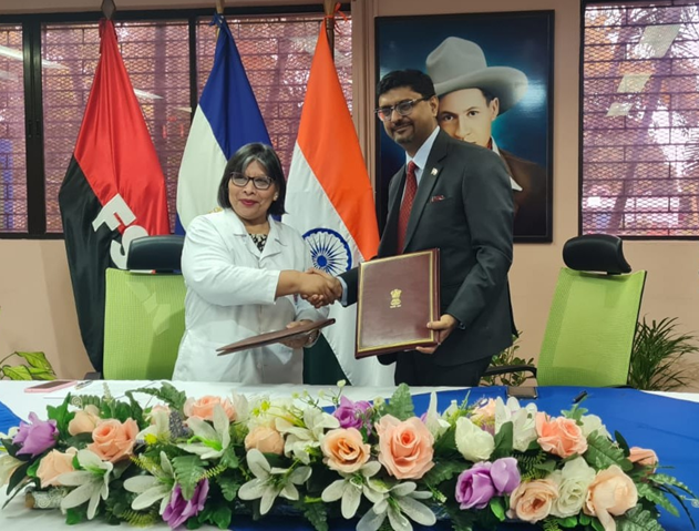 El Embajador de India, Doctor Sumit Seth, y la Doctora Martha Reyes, Ministra de Salud (MINSA), firmaron el Memorándum de Entendimiento sobre Cooperación Farmacopea entre la Comisión de Farmacopea India (IPC), Ministerio de Salud y Bienestar Familiar del Gobierno de India y el Ministerio de Salud de Nicaragua, sobre Cooperación en el Campo de la Regulación de Medicamentos.