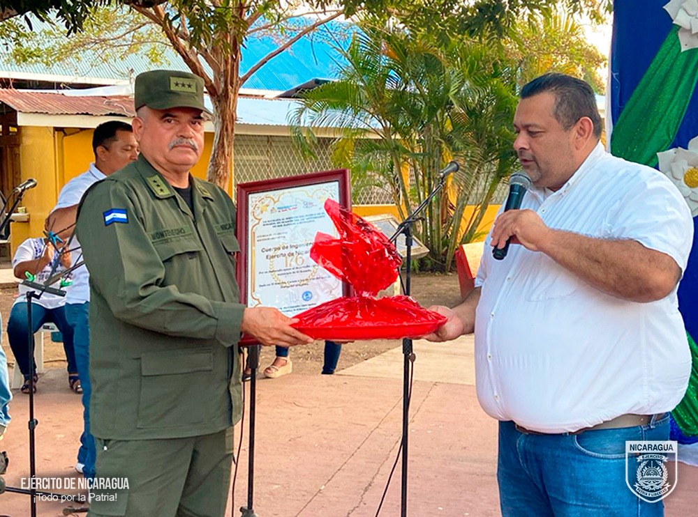 El Ejército de Nicaragua consecuente con el lema de que “Somos el Pueblo mismo uniformado trabajando en su propio beneficio”, el 9 de marzo de 2024, a través del jefe del Cuerpo de Ingenieros “General de Brigada Miguel Ángel Ortez y Guillén”, Coronel Ing. DEM Omar Joaquín Montenegro Martínez, participó en el acto del 176 aniversario de ser elevado a municipio El Rosario, departamento de Carazo, por parte de la Asamblea Nacional de Nicaragua.