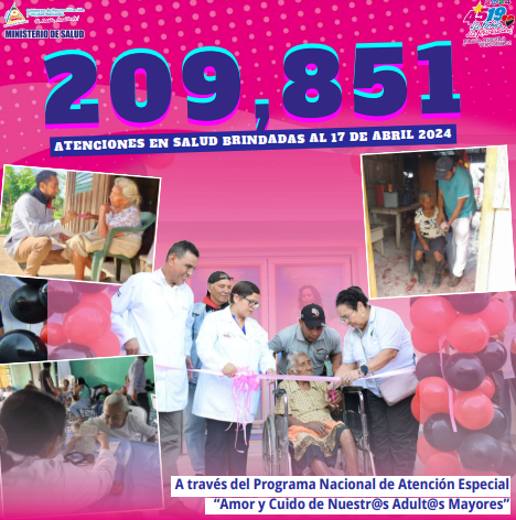 En cumplimiento al Programa Nacional de Atención Especial “Amor y Cuido de Nuestr@s Adult@s Mayores”, acumulado al 17 de Abril 2024, hemos brindado 209,851 atenciones en salud, realizando las siguientes acciones: